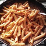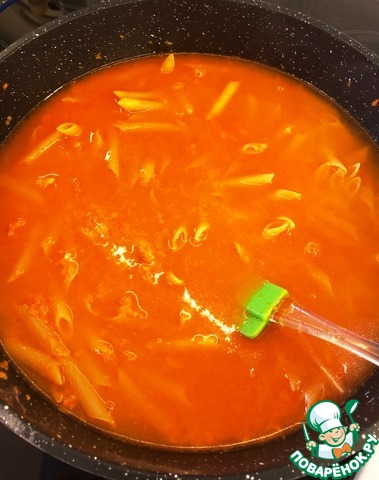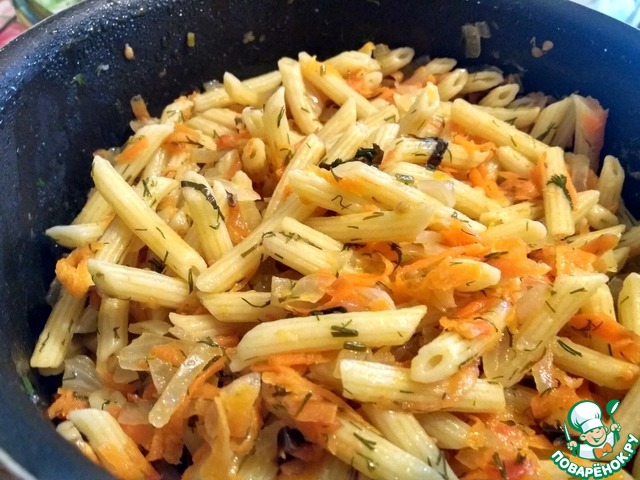 Высыпать макароны. Перемешать. Добавить воды так, чтобы она покрыла макароны. Посолить и накрыть крышкой. Готовить макароны на среднем огне, согласно времени указанному на упаковке.