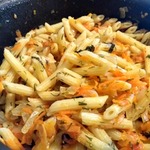 Лук, морковь (можно добавить сельдерей), чеснок измельчить в блендере. Конечно же, можно и нашинковать ножом, кому как нравится. На мой вкус, при измельчении в блендере текстура становится более шелковистой и мягкой, что хорошо сочетается с макаронными изделиями.