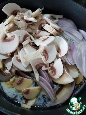 В сковороде с высокими краями растопить сливочное масло. Добавить нарезанные шампиньоны и лук. Лук можно использовать любой и даже зелёный. Обжарить всё до золотистого цвета.
