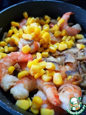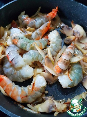 Добавить очищенные креветки. (Их можно предварительно отварить, на ваше усмотрение). Перемешать. Готовить до тех пор, пока креветки не станут красными.