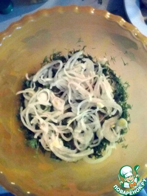 Начинаем выкладывать. Салатницу смазать маслом. Грибы шляпками вниз выкладываем на дно. Присыпаем зеленью. Слой лука, и смазать майонезом.