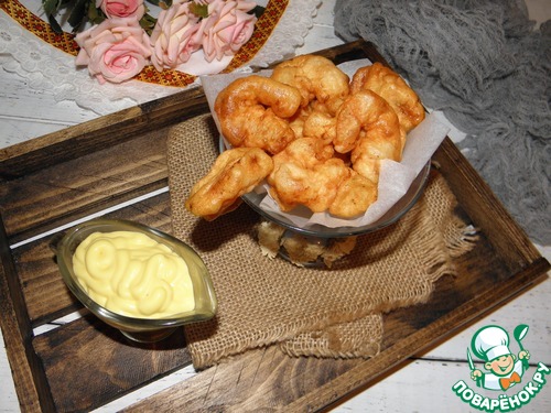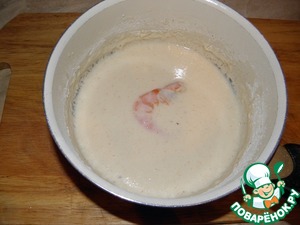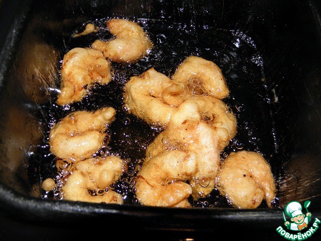 Я готовила во фритюре, предварительно его разогрев ( если делаете в сотейнике, то на среднем огне накаливаем растительное масло) окунаем креветки в кляр