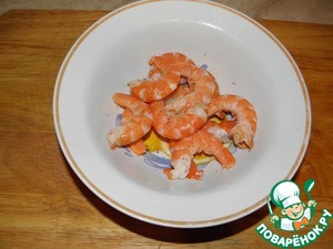 Размороженные креветки очищаем от панциря и кишечной вены. Сбрызгиваем лимонным соком, солим и перчим.