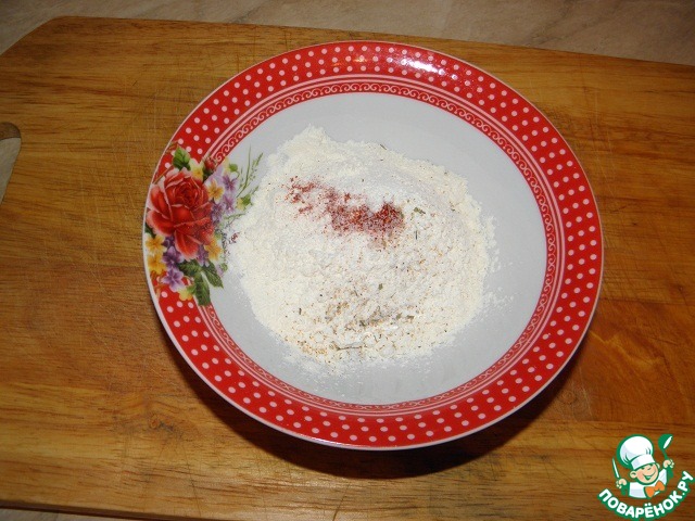 Муку смешиваем с чесночным порошком, паприкой и чили перцем, добавляем еще немного соли и перемешиваем.