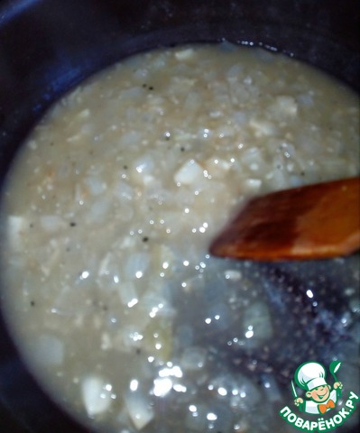Готовим заливку. Репчатый лук и чеснок измельчим, обжарим, Присыпем 1 ч. л. крахмала и 1 ч. л. муки, добавим имбирь, соль, перец, другие любимые Вами специи, перемешаем и...