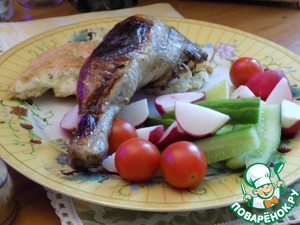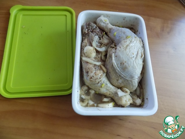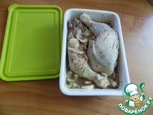 Для курицы-гриль я отрезала от целой курицы 2 окорока. Помыла, обсушила, натёрла солью, сумахом, выложила в посуду. Порезала лук полу-кольцами и дольки чеснока, залила всё гранатовым соком и дала помариноваться 1 час.