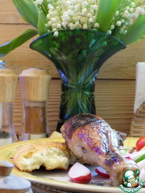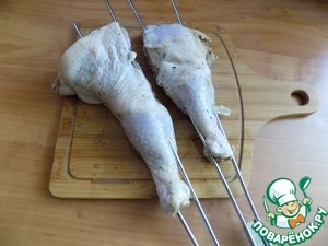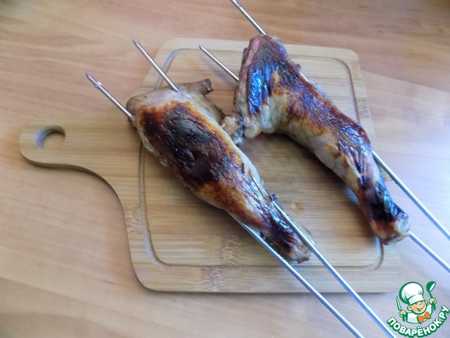 Включила духовку гриль, вставила решетку (у меня специальная под шампура) и вниз поставила поддон, чтобы сок капал туда при готовке. Нанизала ноги на шампура. Шампура разместила на решётке и жарила 30 минут периодически переворачивая.
