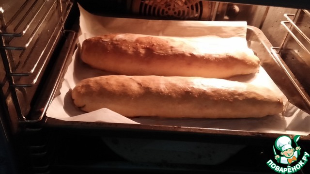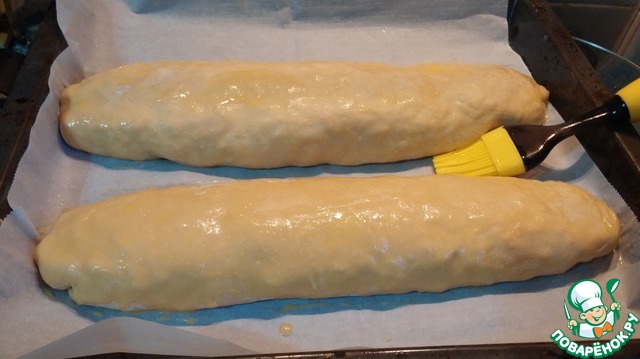 Скатать рулеты, хорошо защипать шовчик и уложить на застеленный пергаментом противень, только вот смазывать яйцом не рекомендую, корочка при выпечке подсыхает.