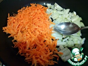 Овощи очистить. Репчатый лук нарезать кубиками, морковь натереть на крупной тёрке, и обжарить овощи на подсолнечном масле. Готовить, помешивая, 5-7 минут. Приправить по-вкусу солью и чёрным молотым перцем, немного остудить.