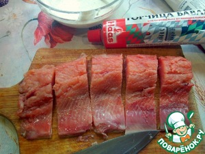 Филе рыбы порезать на кусочки шириной примерно 4-5 см.