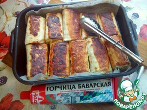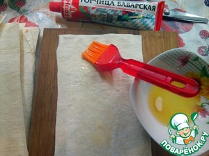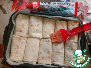 Выложить конвертики в форму, застеленную пергаментом. Смазать их сверху остатками сметанно-горчичного соуса или маслом.