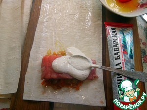 С одного края лаваша выложить 1 полную столовую ложку луково-морковной смеси. Сверху кусок рыбного филе. На филе 2 ч. ложки сметанно-горчичного соуса.