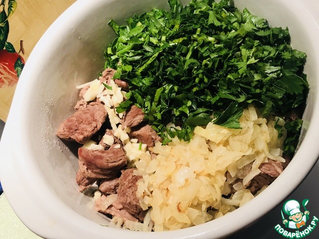 Мелко нарезать чеснок и зелень, добавить к мясу.