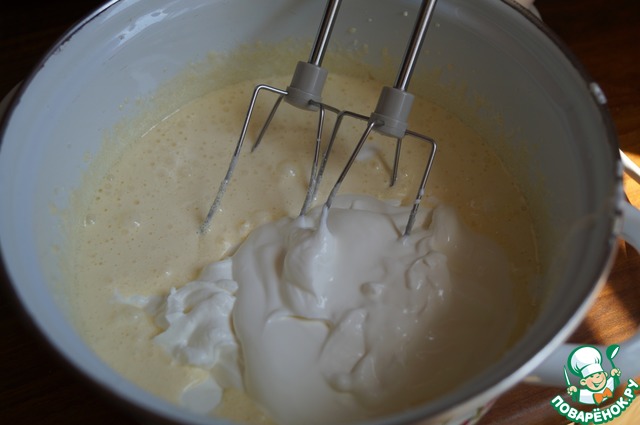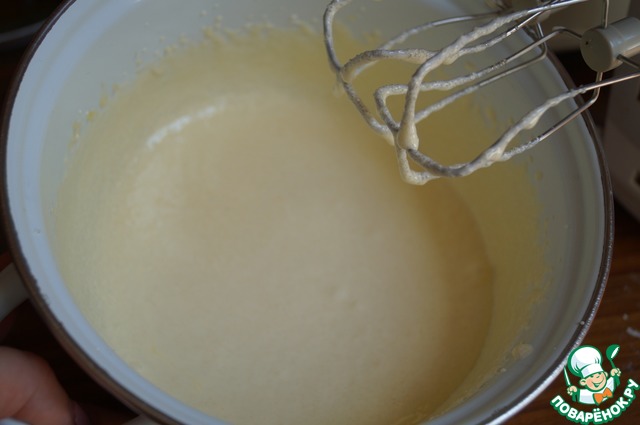 Яичные желтки взбить с сахаром до белой воздушной массы.