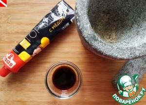 Подготовим маринад - смешаем горчицу с мёдом ТМ ХААС (очень удобно 2 в 1 - раньше всегда боялась с мёдом переборщить), соевый соус, свежемолотый черный перец и соль. С солью будьте осторожны, помните, что соевый соус достаточно соленый. Я буквально кладу пол щепотки.