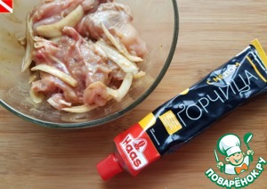 Лук нарезать полосками. С куриных голеней /бедер снять мясо. 300 г - это уже чистый вес мяса. Все положить в маринад, перемешать, затянуть пленкой и убрать в холодильник минимум на полчаса - как раз хватит, чтобы добраться до дачи.
