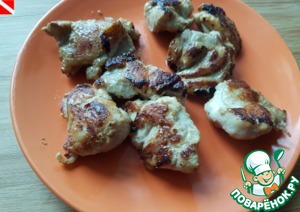 Кусочки курочки поджарить на гриле в решетке до готовности.