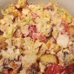 В идеале, конечно же для крутонов нужно использовать чиабату, но у меня редко бывает такое счастье - лишнее свободное время, чтобы ее испечь. Но другой хлеб домашнего "производства" есть в наличии всегда. Сегодня это был батон пшеничный по этому рецепту - http://www.povarenok .ru/recipes/show/244 43/. Вписался надо отметить идеально! Так вот хлеб рвем на небольшие кусочки и кладем в оставшийся от курицы маринад, перемешиваем, чтобы маринад впитался и обжариваем на мелкой решетке. Жарить лук или нет - решать вам, я жарю, люблю его в салате.