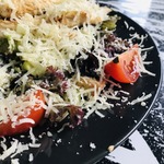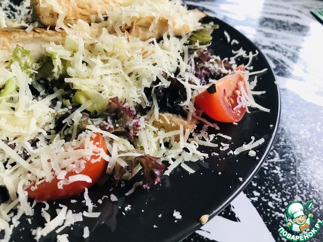 Собираем салат - помидоры режем на половинки, салат моем, сушим, рвем. Пармезан или любой другой твердый ароматный сыр нарезаем тонкими слайсами. Кусочки курицы нарезаем полосками. Все перемешиваем, добавляем крутоны, заправляем оливковым маслом. Все - отличный салат готов!