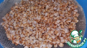 Заливаем гречневую крупу водой и оставляем на 2-3 часа. После чего отбросить в дуршлаг, дать стечь воде.