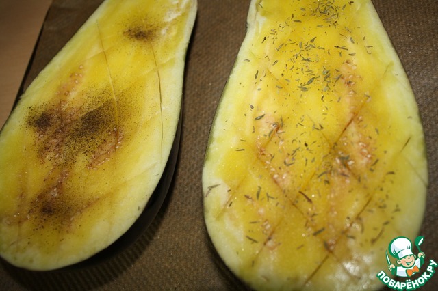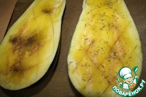 Баклажаны разрезать пополам и нарезать мякоть не прорезая шкурки.