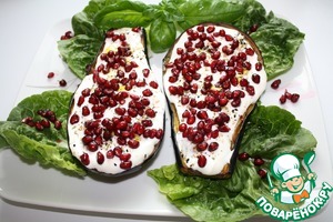 Готовые баклажаны полить соусом, посыпать зернами граната и сбрызнуть маслом.