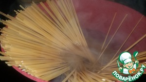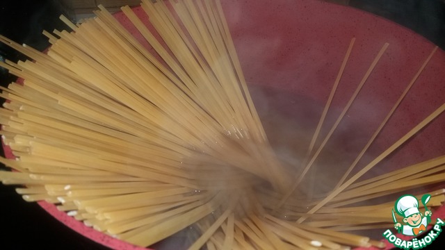 Макароны отвариваем в подсоленой воде. Варим до состояния альденде (на 2 мин меньше указанного на упаковке времени)