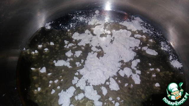 Начинаем подготавливать соус "Бешамель". Разогреваем в кастрюле масло, всыпаем муку и быстро размешиваем. Мука заваривается моментально, работать нужно быстро.