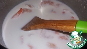 Вливаем молоко и бросаем креветки в соус. Варим, помешивая, до загустения. Солим. Перчим.