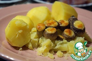 Блюдо из разряда "проще не придумаешь". Такие мини-шампиньоны жаль даже сдабривать приправами из боязни лишить их свежести вкуса. Поэтому я поступил в данном случае очень экономно: использовал для фаршировки только сливочное масло и полутвердый сыр, который охотно плавится.