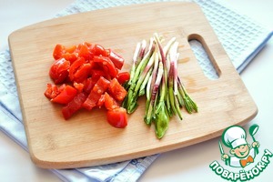Болгарский перец очистите от семян и нарежьте на произвольные куски. Черемшу промойте и обсушите.