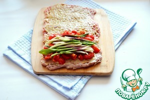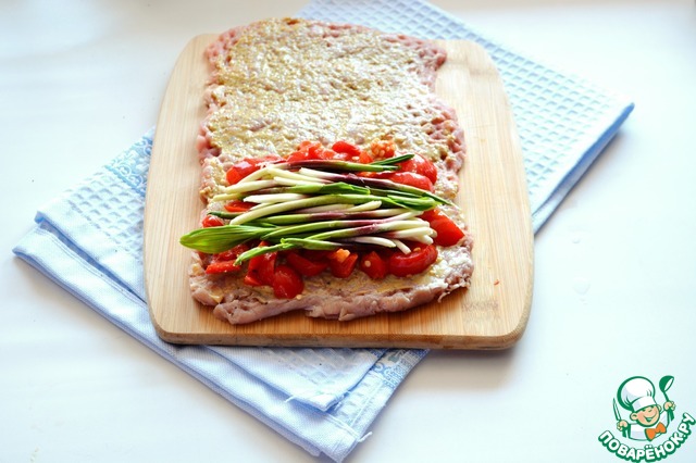 На один край мяса выложите овощи, чуть подсолите их и прижмите ладонью