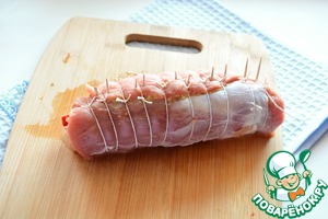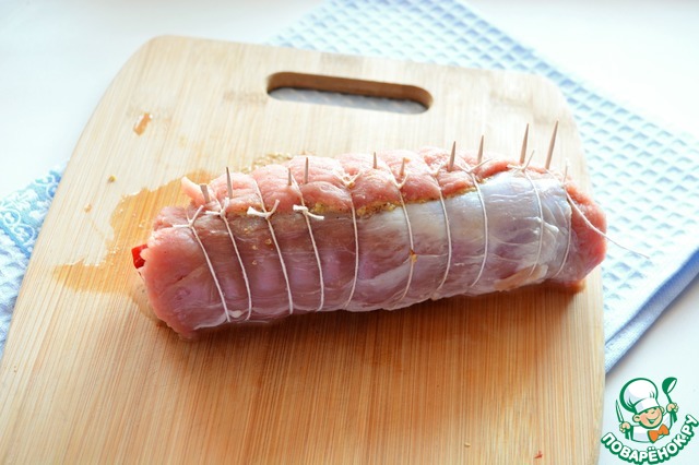 Аккуратно сверните всё рулетом. Сколите его зубочистками и обвяжите нитками