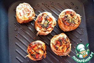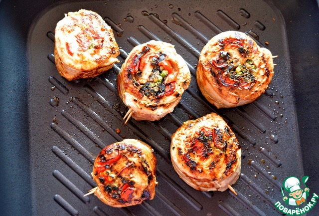 Жарьте рулетики на раскаленном гриле или сковороде-гриль с двух сторон.