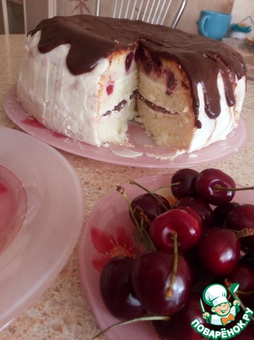 Из черешни удалить косточки. Выложить равномерно ягоды на тесто. Если вы хотите, чтоб ягоды были распределены по всему объему теста, слегка обваляйте их в муке. Мне же интересно, когда все ягоды оказываются вверху пирога. В таком случае пирог можно разрезать пополам, не повредив ягоды, и прослоить его кремом.