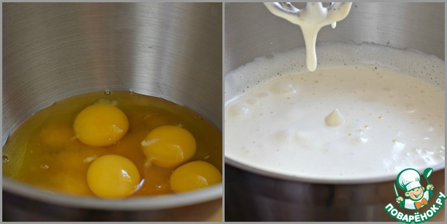 Яйца (С1) смешать с сахаром. Взбить на самых мощных оборотах миксера до увеличения массы в 4-5 раз. Лучше взять сахар мелкий - процесс взбивания пройдет быстрее и легче.
