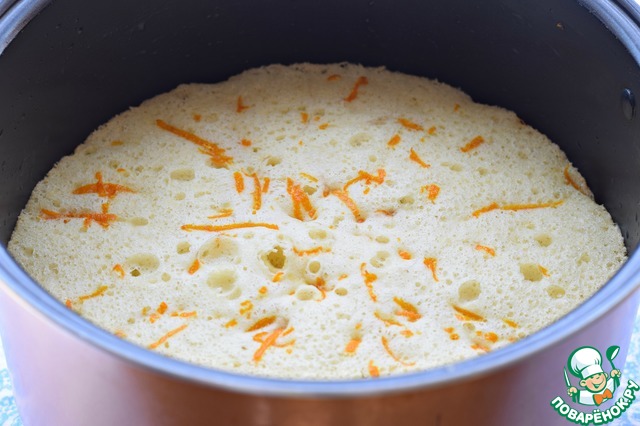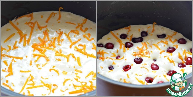 Поверх теста разложить апельсиновую цедру. (цедру снять при помощи овощерезки или просто натереть ее на терке)