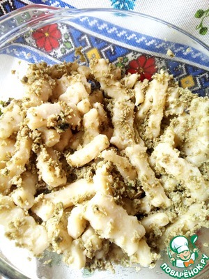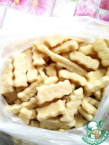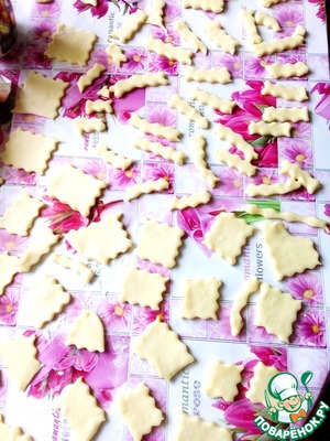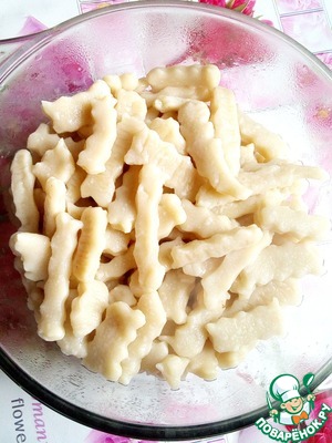 Тесто я раскатываю и нарезаю полосочками, кусочками, да как угодно.