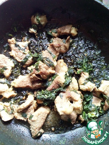 Мясо обжариваю на растительном масле, солю по вкусу, добавляю зелень и вместе обжариваю немного.