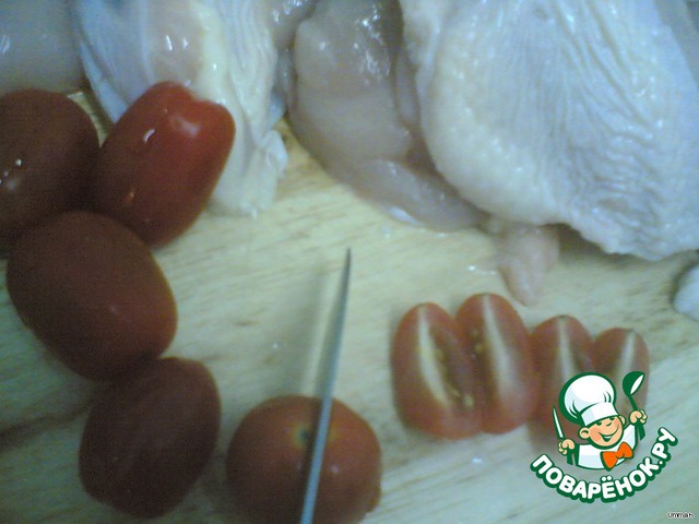 • Каждый куриный кармашек наполнить нарезанными томатами черри и мелко нарезаным чесноком.