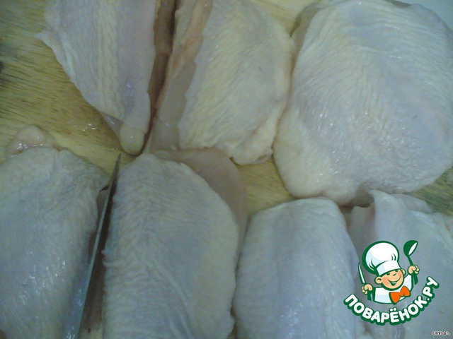 • Куриную грудку промыть, просушить, разрезать на две части ровно по середине.