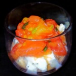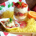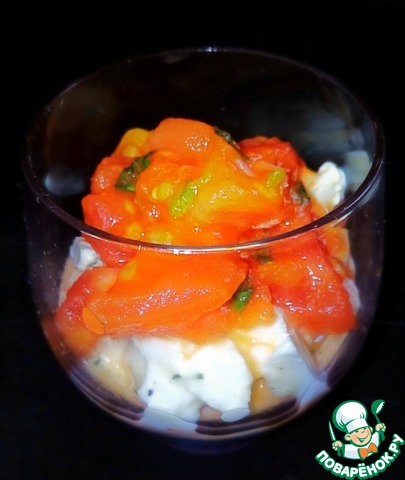 Очень вкусный, сочный, нежный и оригинальный салат. Подавать его лучше порционно - в креманках или в стаканах.