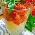 Мелко нарезать базилик и чеснок и добавить к помидорам.