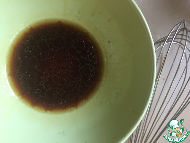 Готовим соус. Мелко мелко режем чеснок и имбирь. Смешиваем их с соевым соусом, мирином, уксусом, кунжутным маслом. (На фото пока только жидкие составляющие) Мирин - это очень сладкое китайское вино.