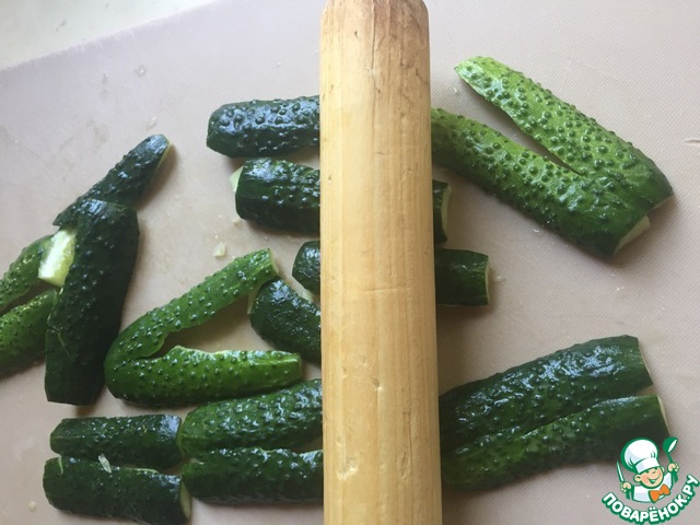Отбираем у жены скалку (если конечно удастся) и отбиваем огурцы до небольшой мягкости. В кашу превращать не нужно. Огурцы должны стать мягкими, чтобы впитать маринад, но и похрустывать при этом.