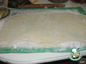 На стол выкладываем невафельное полотенце, желательно с рисунком, посыпаем его мукой и начинаем тонко-тонко раскатывать тесто, так чтоб сквозь него просвечивался рисунок. Тесто получается отличное, раскатывается очень легко.