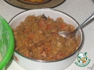 Приготовим начинку: в сковороду наливаем масло и кладем мелко порезанный лук и морковь. Обжарим до золотистого цвета. Добавляем пошинкованую свежую капусту и квашеную, добавляем специи, лавровый лист, когда впитает масло, доливаем томатный сок, томатный соус и тушим до готовности, по необходимости добавляя воду. Тушится где-то минут 30-40. По вкусу добавляем сахар, соль.