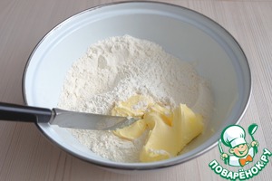 В миску добавить муку (200 гр.), добавить размягченное сливочное масло (100 гр.), добавить разрыхлитель (1 ч. ложка)
