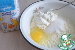 Добавить к творожной массе яйцо (1 шт.), сметану (150 гр.), добавить тапиоковый крахмал (50 гр., тапиоковый крахмал можно заменить картофельным крахмалом), добавить сахар (4 ст. ложки). Смесь хорошо вымешать до однородной консистенции.