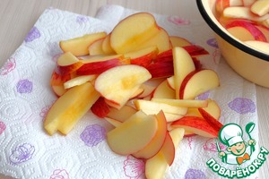 В миску добавить воду, добавить сок 1/2 лимона, поместить в воду с лимонным соком яблочные дольки, эта смесь предотвратит потемнение яблочных долек. Затем дольки обсушить бумажным полотенцем.